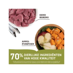 Rauwe grasgevoerde lam (8%), verse eend (8%), verse hele eieren (8%), lamsvleesmeel (8%), haringmeel (7%), kalkoenvleesmeel (7%), hele groene erwten, hele rode linzen, hele kikkererwten, wildgevangen snoek, rauwe lamslever (4%), verse eendenlever, -hart en niertjes (4%), verse kalkoenvlees (4%), lamsvet (4%), hele groene linzen, hele kievitsboon, hele gele erwten, zongedroogde alfalfa, pollockolie (2%), linzenvezels, gedroogd lamskraakbeen (1%), gedroogde lamspens (1%), gedroogd bruinwier, verse pompoen, verse kalebas, verse pastinaak, verse boerenkool, verse spinazen, verse mosterdzaden, verse raapstelen, verse wortelen, verse rode appels, verse bartlett peren, gevriesdroogde lams- en eendenlever (0,1%), verse cranberries, verse blueberries, verse chicoreiwortel, verse kurkuma, verse mariadistel, verse kliswortel, lavendel, heemstwortel en rozenbottel.