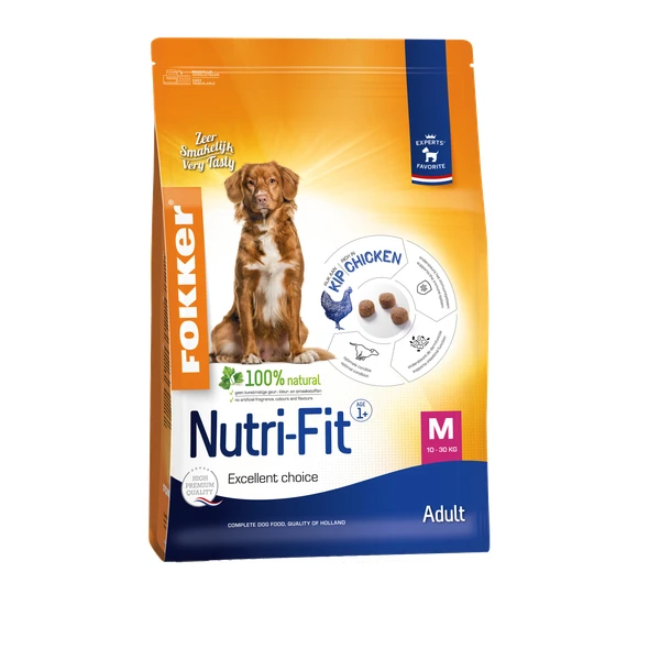 Om jouw hond lichamelijk en mentaal gezond te houden, is het belangrijk dat hij de juiste brokken eet die alle voedingsstoffen bevatten die hij nodig heeft. Nutri-Fit M van Fokker is een high premium brokvoeding geschikt voor volwassen honden van middelgrote rassen met een gewicht van 10 tot 30 kg.