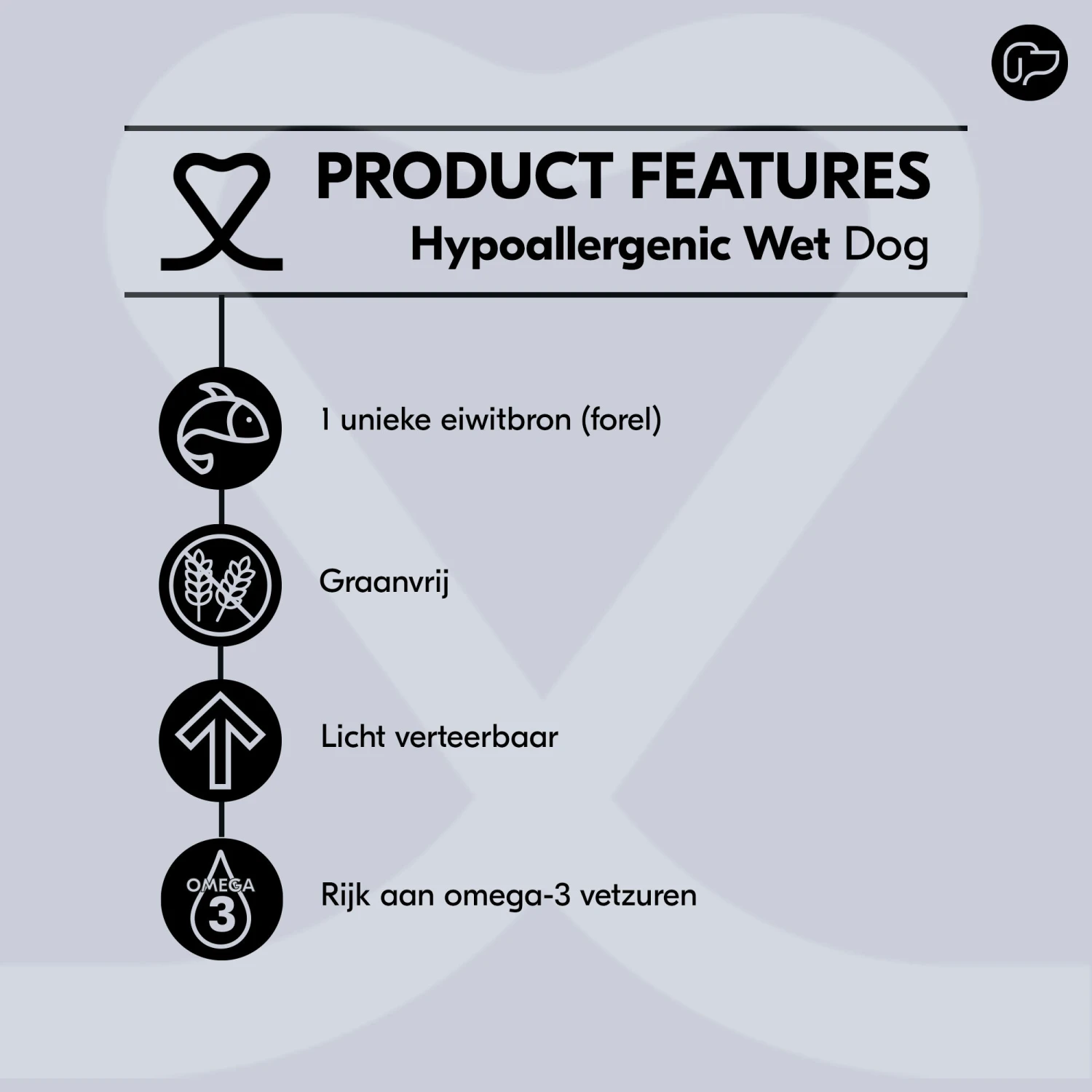 Voedselallergie betekent dat uw hond overgevoelig reageert op bepaalde ingrediënten in de voeding. Het is dan belangrijk deze ingrediënten te vermijden. Vetality Hypoallergenic maakt gebruik van één unieke eiwitbron (forel). De voeding bevat geen koolhydraatbron en is vrij van granen. Zo wordt de kans op een voedselallergie zeer klein. De ingrediënten zijn licht verteerbaar. Hiermee draagt het zorg voor een optimale spijsvertering en gezonde darmflora. Omega-3 vetzuren dragen bij aan een gezonde huid door deze te voeden en te beschermen.