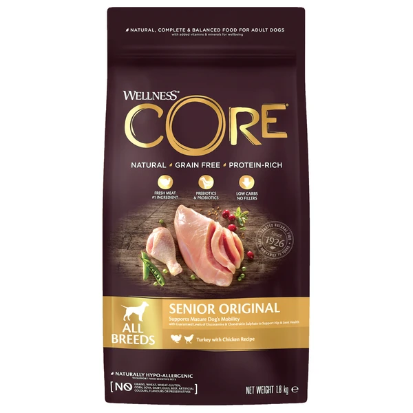 Wellness Core Grain Free Dog Senior Original Kalkoen&Kip β Hondenvoer β 10 kg direct bestellen in onze webshop! Overheerlijke brokken voor senior honden