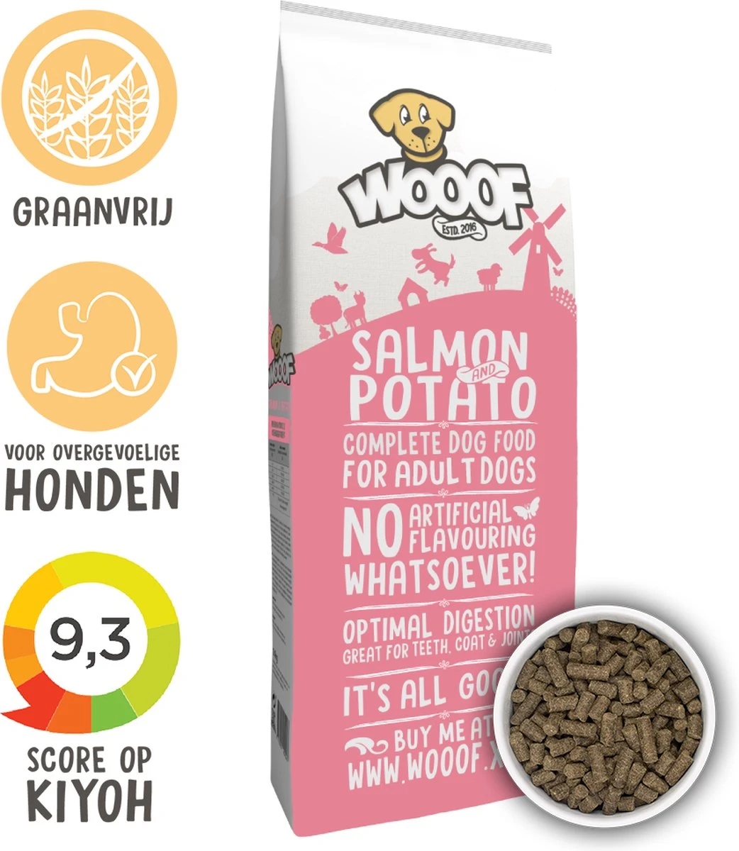 WOOOF zalm & aardappel is een natuurlijke, hypoallergene, 100% graanvrije brok voor alle honden.